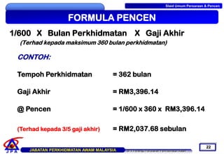Bayaran bagi faedah adalah tertakluk kepada pencen maksimum tiga perlima 35 daripada gaji akhir. Ada mesin vending COMBO. 75 x tempoh perkhidmatan yang boleh dimasukira x gaji hakiki bulanan yang akhir diterima.